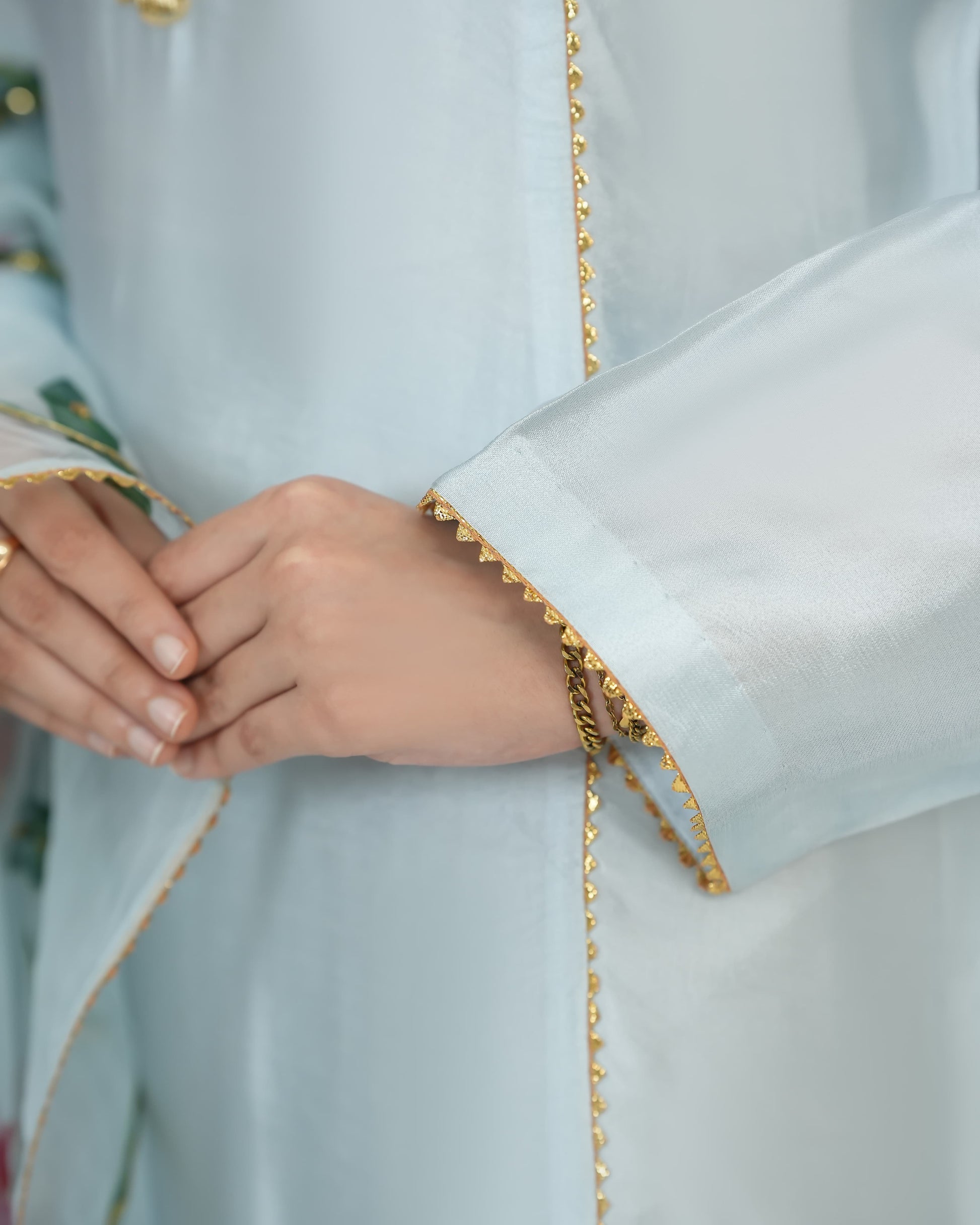 Handwork on the neckline of sheesha silk, paired with an ethereal organza dupatta — both hand-printed and exquisitely embellished. Every stitch whispers artistry, every panel embodies elegance. Designed for the woman whose style is poetry, a harmony of heritage and couture.