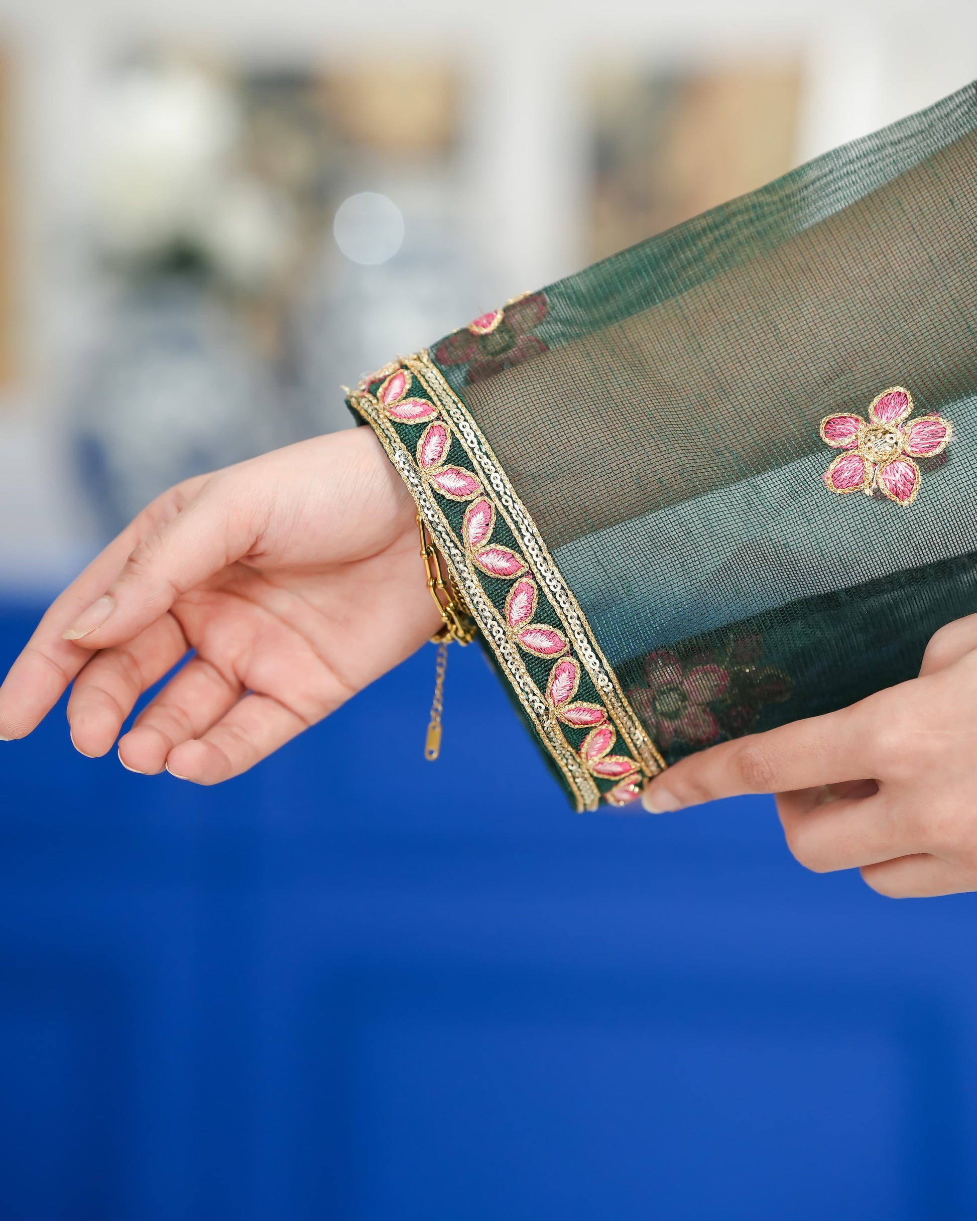 Draped in fully embroidered khaadi net, every thread tells a story of grace and sophistication. Paired with a pure jacquard trouser that adds a touch of royal charm, this ensemble is designed for the woman who embodies confidence, poise, and effortless beauty.