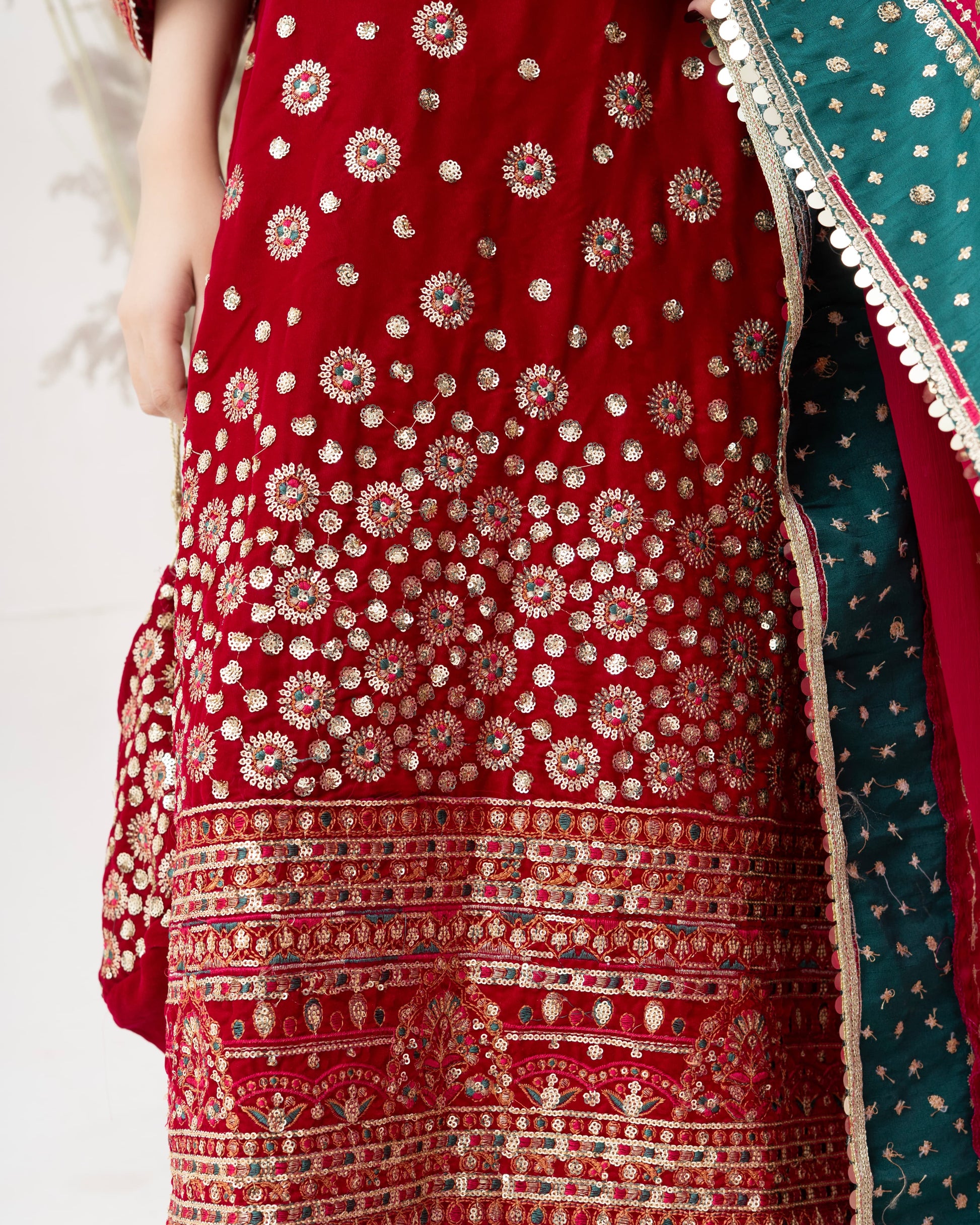 “Experience luxury redefined — our Fancy Velvet Collection featuring intricate handwork, paired with a soft chiffon dupatta and shamoose silk trousers. A masterpiece crafted for timeless elegance. ✨ #RehmanisCouture”